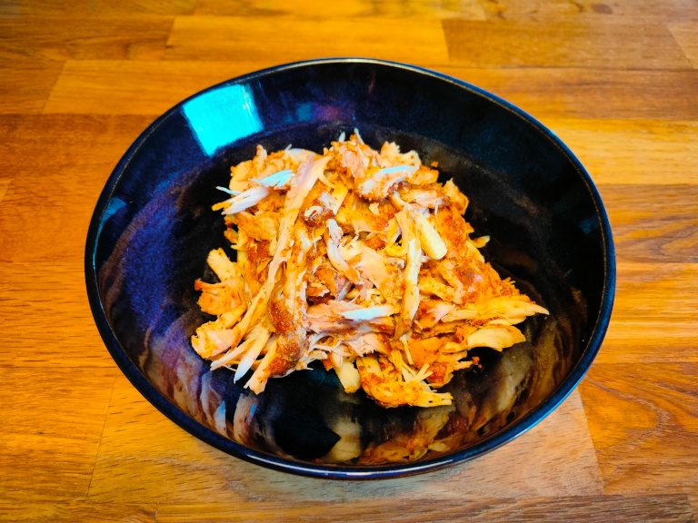 Kødet kan bruges som fyld i f.eks. pitabrød eller i en burger smager dejligt med salat og hjemmelavet BBQ-dressing.