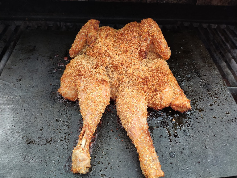 Del kyllingen i 4-6 stykker eller klip den gennem ryggen og giv den et "knæk" så den kan ligges fladt til stegningen/grillningen.