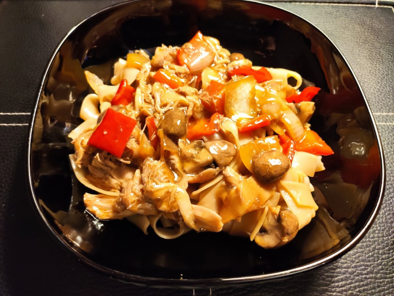 Kyllingekød, bambusskud, champignoner, peberfrugt, chili og bouillon hældes i og steger i 2 min. 2 spsk. soja sauce, sukker og sherry tilsættes og det hele steger indtil rygende varm.