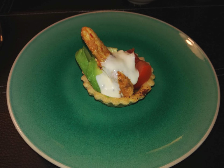 Grøntsagerne fordeles i bundene af tarteletterne, kødet anrettes derefter og til sidst hældes cremé fraîchen på.