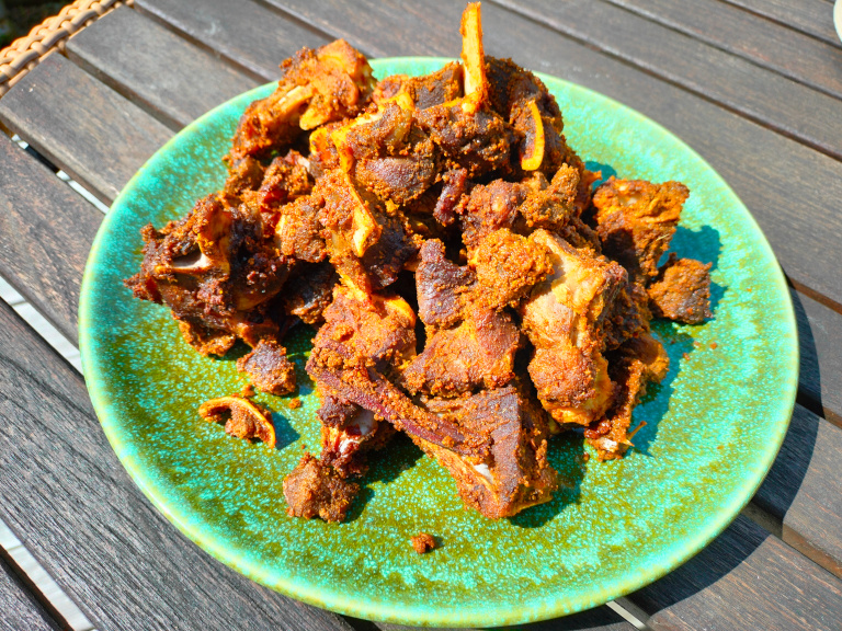 Sennepsolie, spidskommen, koriander, chili, gurkemeje, ingefær og hvidløg blandes sammen en en tyk pasta.