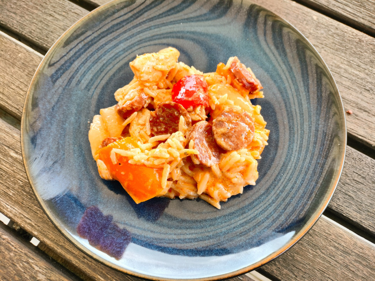 Chorizopølsen og peberfrugt tilsættes, og lad simre under låg indtil kyllingekødet er gennemstegt.
