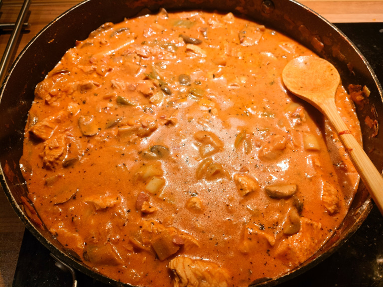 Tilsæt kalkunkødet, drys med paprika og peber og lad stege 10 min.