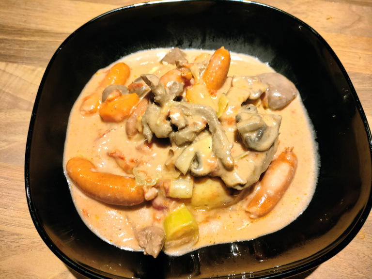 Resten af ingredienserne, undtagen fløden, tilsættes og retten simrer i 1 time ved svag varme.