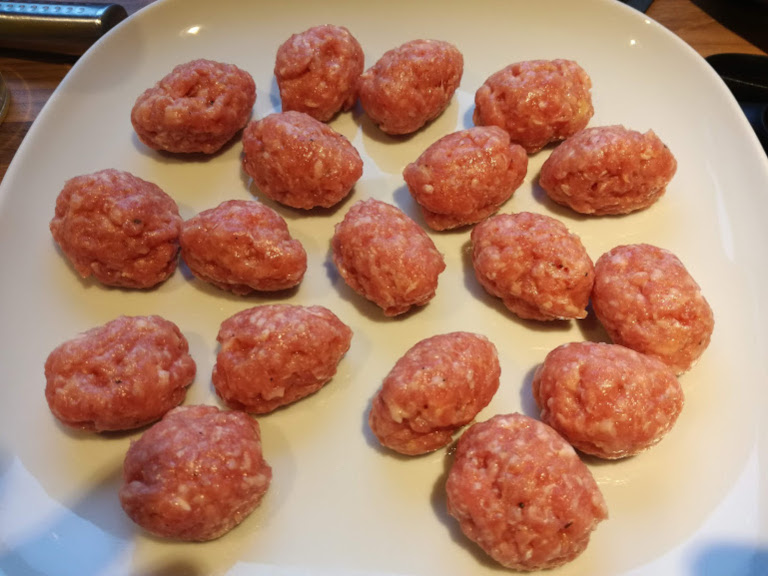 Alle ingredienserne røres godt sammen, formes til små kødboller og koges i letsaltet vand.