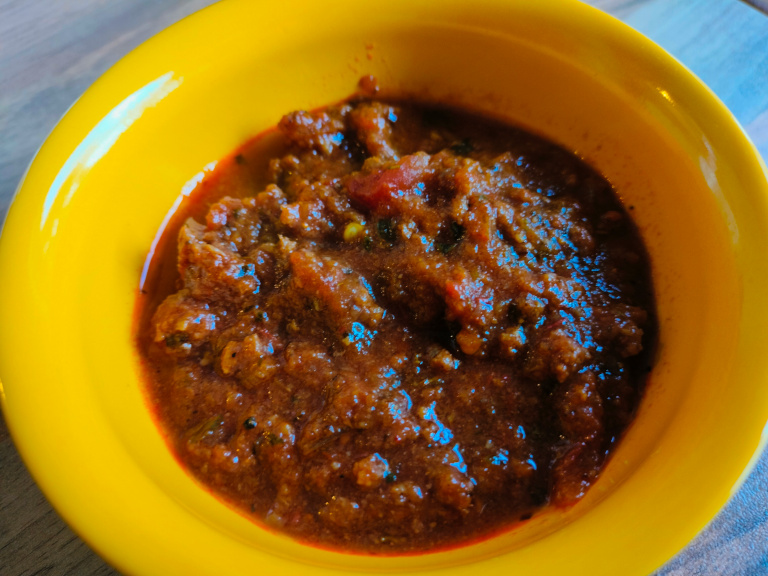 Olivenolien varmes op i en gryde. Karry og paprika svitses i olien, løg hvidløg og chili tilsættes og svitses lidt, hvorefter kødet tilsættes og brunes.