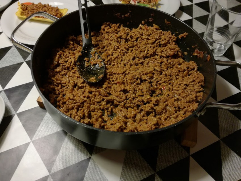 Farsen tilsættes og brunes. Vandet tilsættes og når al væden er fordampet er kødet færdigt.