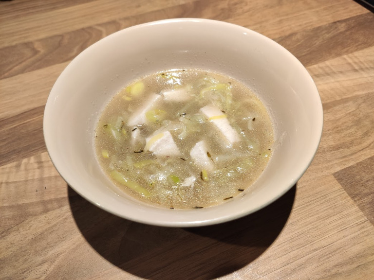 Skær kødet i strimler, varm det i suppen og smag til med salt og peber.