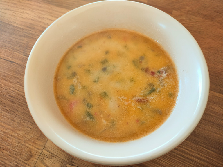 Drys mel over, rør godt og bouillon hældes over. Der røres godt rundt, og suppen koger under låg i ca. 20 min.