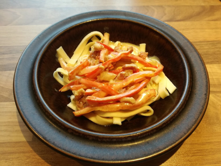 Bacon, løg, hvidløg og krydderierne svitses godt, tilsæt evt. lidt olie.