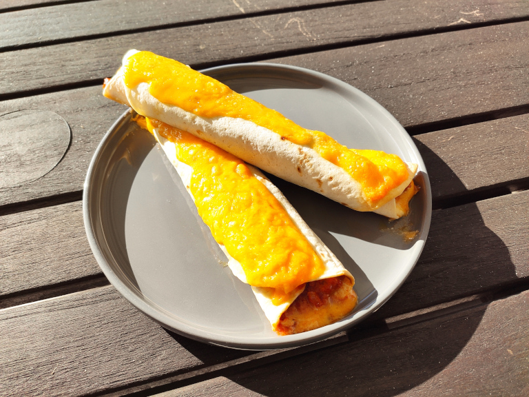 Der drysses med cheddarost ovenpå pandekagerne, der stilles i ovn ved 200° i 15-20 min., eller indtil pandekagerne og osten er smeltet og gylden.