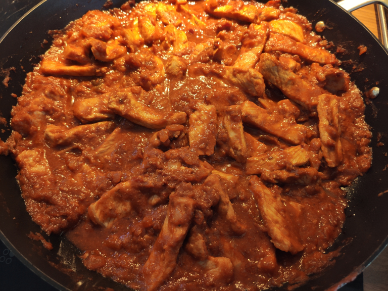 Svinekødet og salsa tilsættes og steger med indtil kødet er mørt.