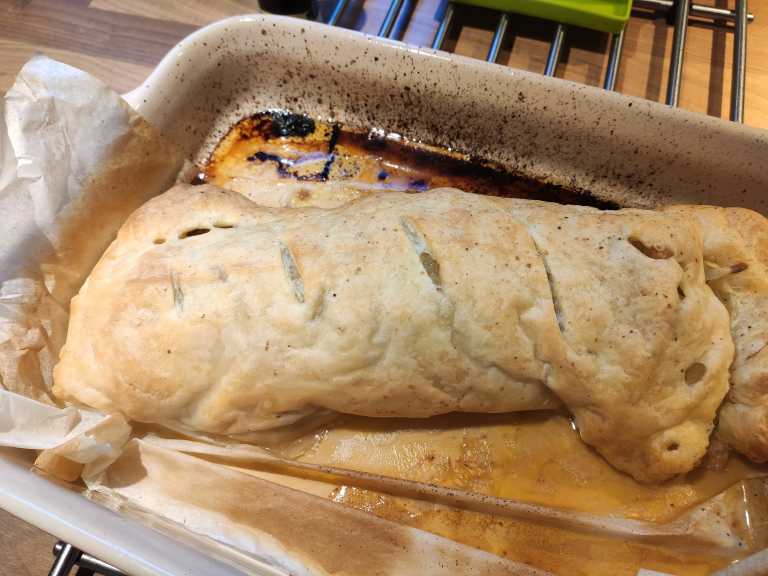 Krydder med salt og peber. Dejen lukkes og bages ved 190° i 35-40 min.