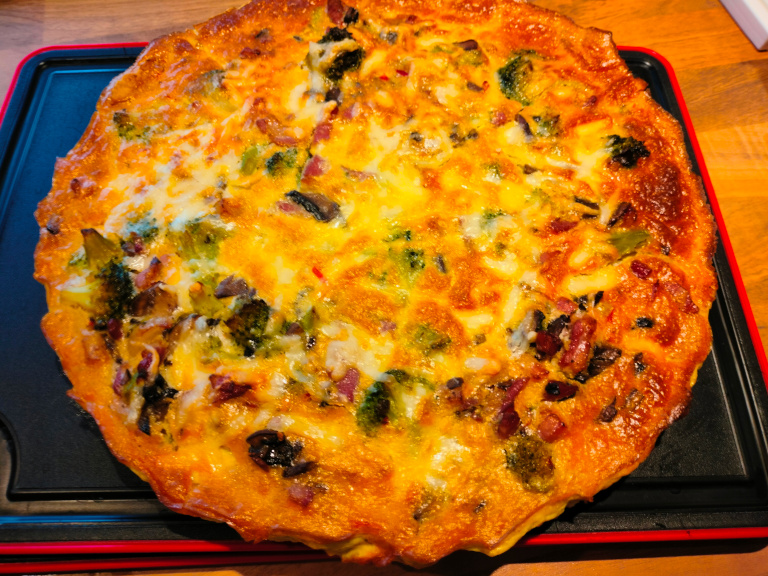 Æggemassen hældes over til sidst og quichen bages ved 200° i 30-35 min.