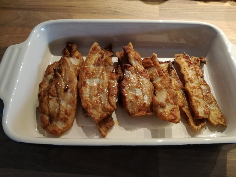 Flæskeskiverne steges indstil sprøde ved 180°, husk at vende.