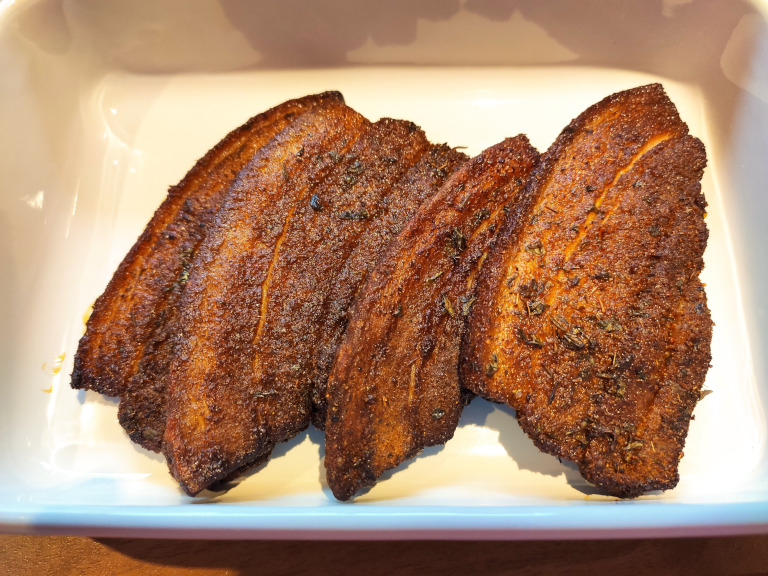 Flæskeskiverne adskilles godt og hældes derpå i posen, der rystes indtil alle stykkerne er dækket.