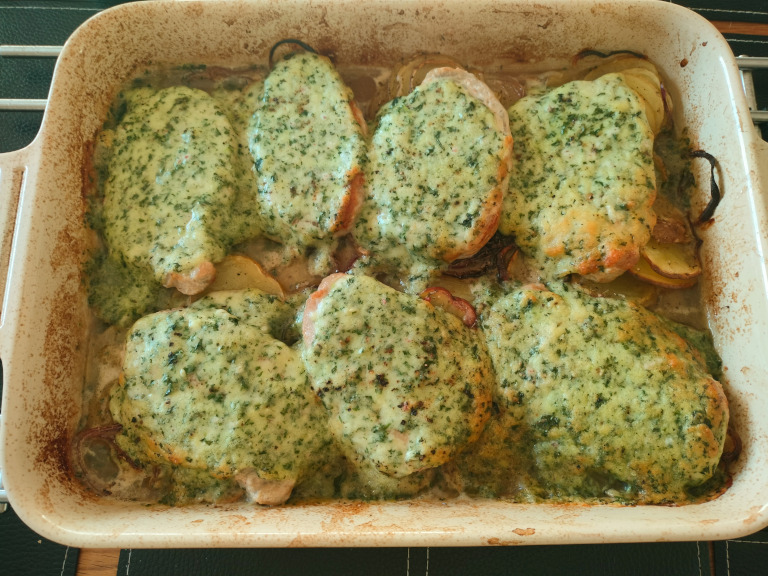 Efter de 40 min., anrettes de brunede koteletter oven på kartoflerne. "Låget" øses over og fadet sættes tilbage i ovnen, uden folie, i 15-20 min.