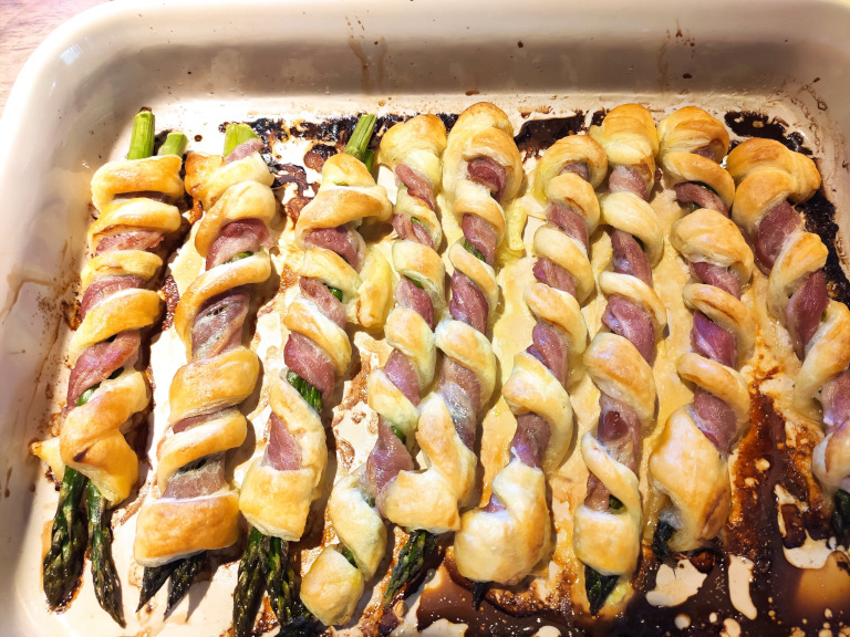 Svøb igen med en strimmel butterdej - prøv at ramme i de "huller" bacon stykkerne har efterladt. Placer i et smurt ildfast fad.