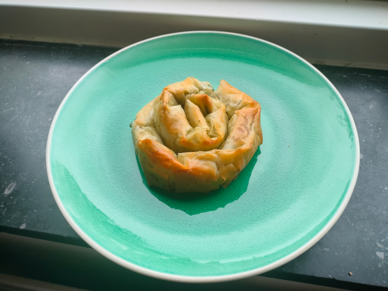 Placer börek på en bageplade, pensl med smør og bag ved 200° i 15-20 min.