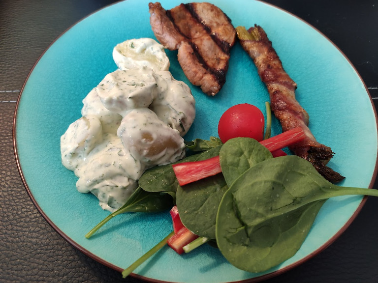 Creme fraîche, mayonnaise, de grønne urter og sennep røres godt sammen.