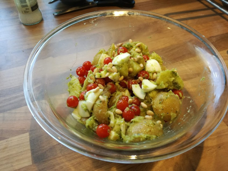 Når kartoflerne er blevet kølige, vendes de halverede tomater, pinjekernerne og de hakkede æg i.