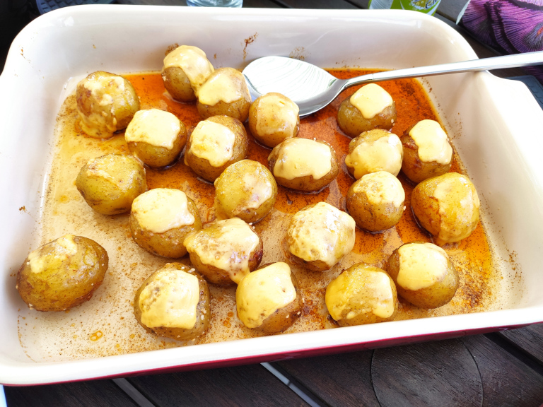 Kartoflerne hældes over i et ildfast fad og stilles i ovn ved 180° i ca. 15 min.