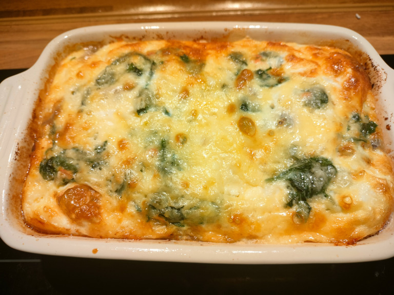 Æg og mælkk piskes sammen og hældes over spinat og fetablandingen.