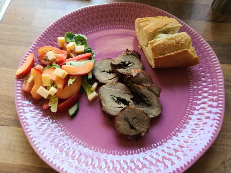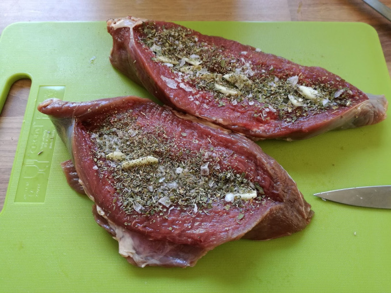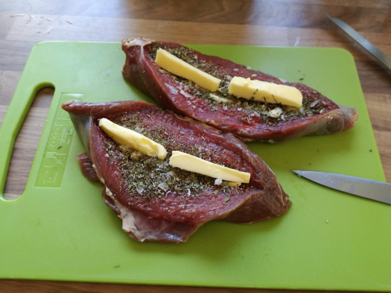 Hvidløg, salt, peber, urteblandingen og smør fordeles inden i kødet, der derefter lukkes så godt som muligt med kødnålene.