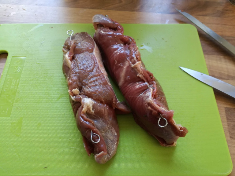 Dådyrkødet, pudses af, uden at fjerne den sparsomme fedt der er på kødet. Der lægges et snit i kødet, til at putte fyld i.