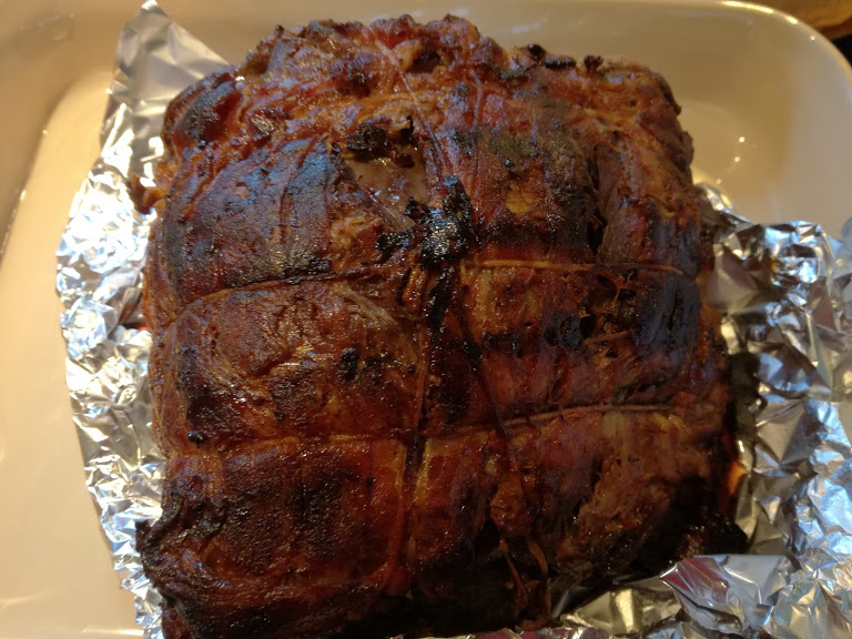 Køllen tages op af marinaden og pakkes ind i bacon - helt ind - og binde lidt snor omkring stregen for at holde på baconen.