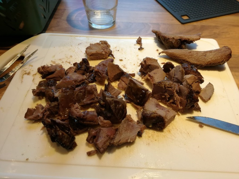 Kødet tages op af stegesoen, og fjern ben og skær kødet ud i mundrette bidder.