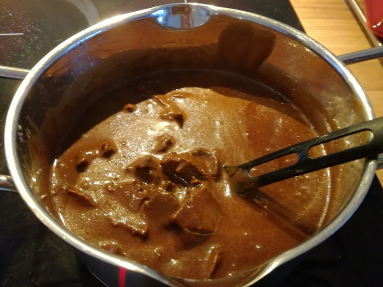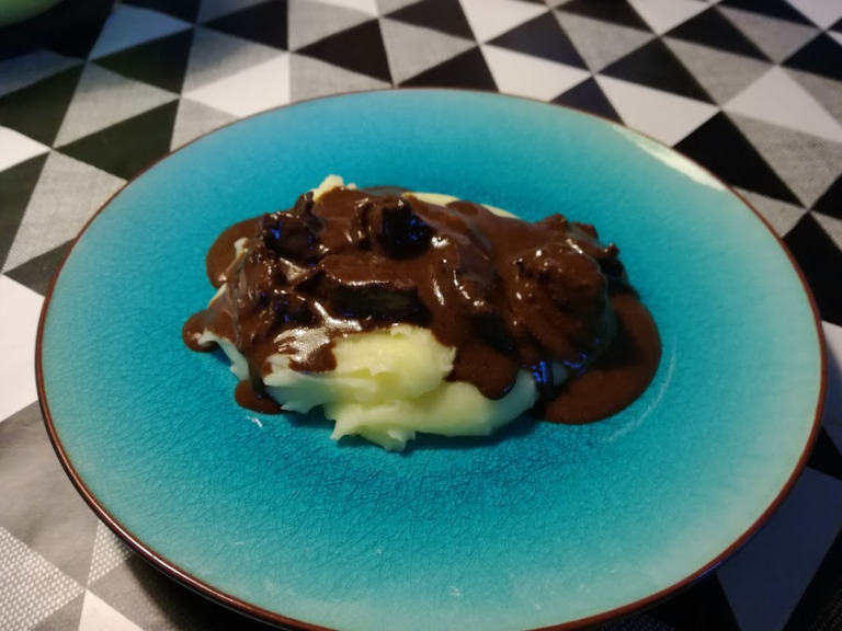 Stegeskyen sies og hældes over i gryde. Varm op, jævn med majsstivelse (hvis man synes, kan man tilsætte lidt sovsekulør) og hæld kødet i saucen.