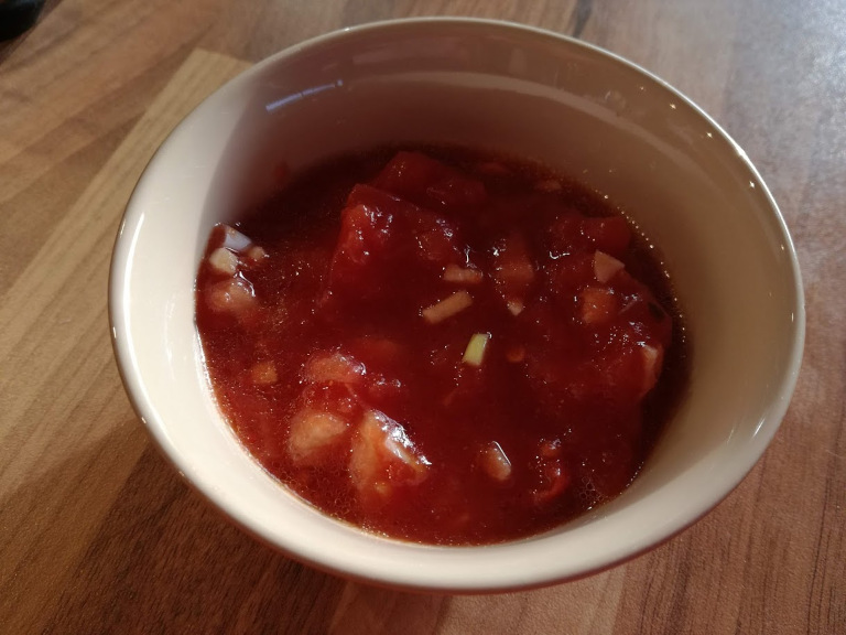 Det hele hakkes sammen. Hvis saucen ønskes meget fin, hakkes ingredienserne, eget fint (ja næsten blendet). Hvis saucen derimod ønskes ?chunky?, skæres ingredienser ud i små tern ved håndkraft.