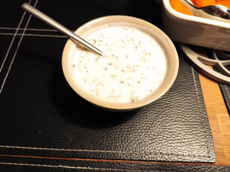 2 dl yoghurt naturel ½ tsk. hvidløgspulver 1 tsk. tørret persille ½ tsk. tørret purløg ½ tsk groft salt
