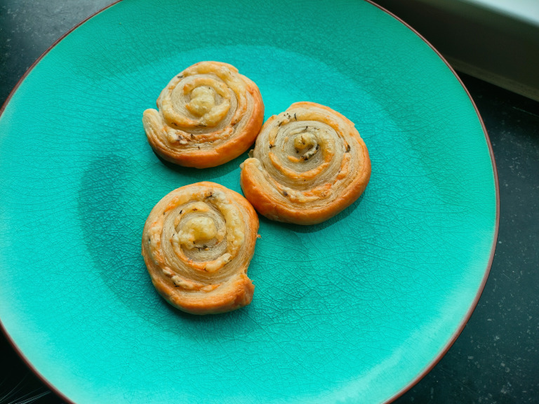 Rouladen skæres ud i 20-30 stykker, der placeres på et stykke bagepapir på en bageplade og bages ved 200° i ca. 12 min.