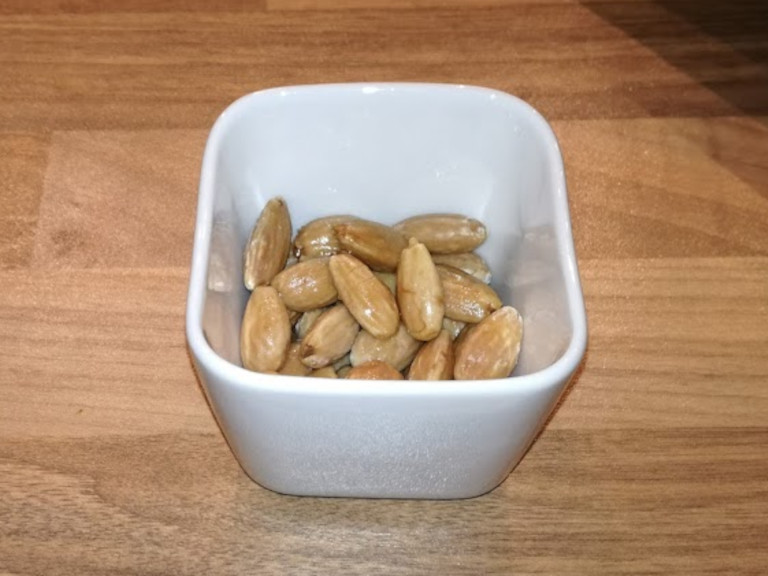 Mandlerne varmes i ovnen indtil de er gyldne, ved 150-180°. Der skal vendes rundt i dem ret tit.