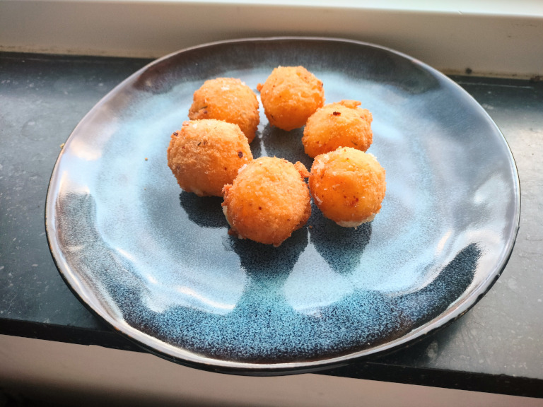 Mozzarellakuglerne bliver nu dobbel paneret: dyp i æggemassen, vend i raspeblanding, dyp igen i æggemassen og vend igen i raspblaningen.
