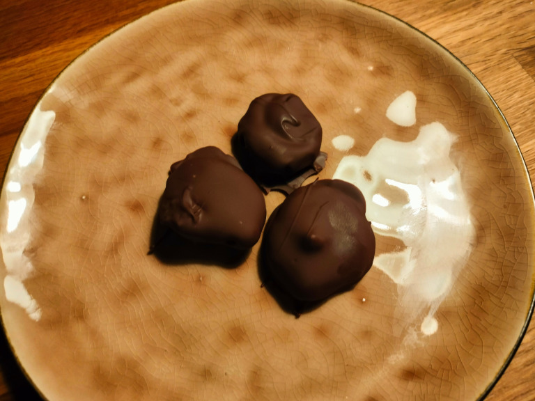 Toppene dyppes hurtigt i chokoladen, lægges på rist eller bagepapir.