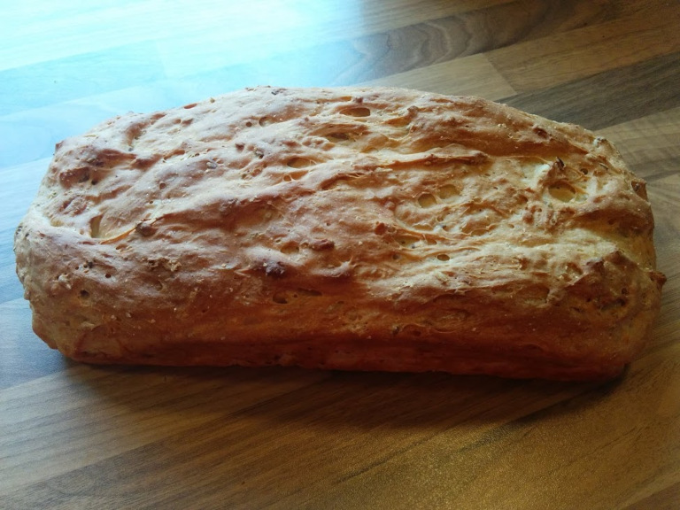 Dejen æltes godt igennem og stilles til hævning et lunt sted i 35 min, derefter slås dejen ned, formes til et brød og efterhæver i 30 min.