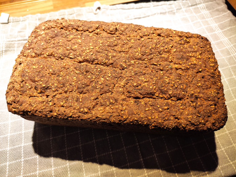 Anbefaling: lad brødet køle af natten over, før man skærer i det - det kan ellers blive klægt.