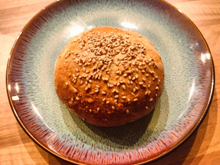 Bollerne pensles med sammenpisket æg, drysses med sesamfrø og bages ved 180°, i 20 min.