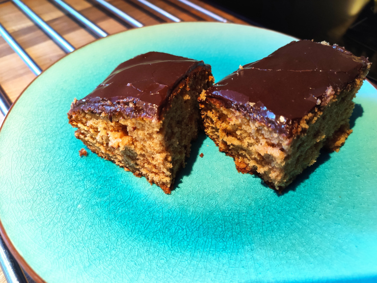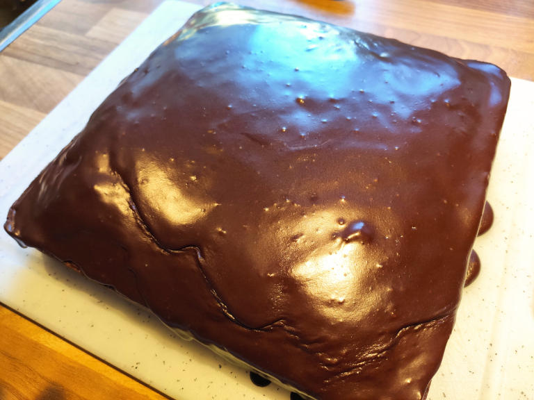 Ingredienserne røres godt sammen og den bagte, kolde kage overtrækkes med glasuren.
