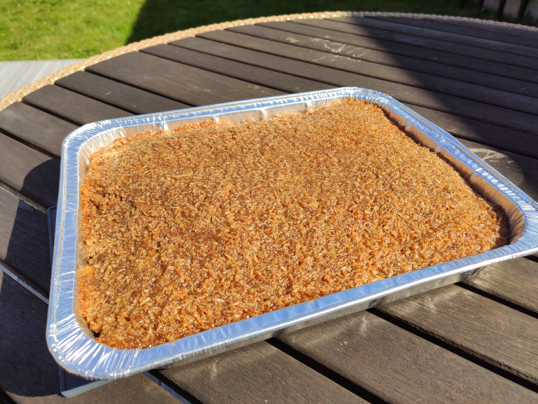 Kagen tages ud og ?låget? fordeles ovenpå. Kagen stilles i ovnen igen og bager i yderligere 5 min. ved 225°.