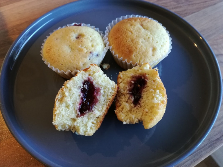Dejen fordeles i muffinformene på følgende måde: halvdelen af dejen fordeles i formene. En klat marmelade lægges ovenpå og til sidst fordeles resten af dejen øverst.