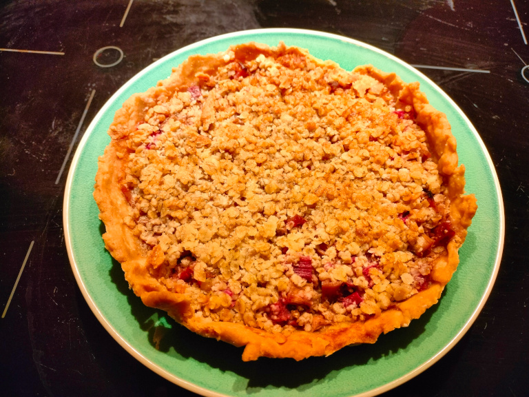 Bland rabarber, kartoffelmel, kanel, vanilje, flormelis og havregryn sammen. Fordel blandingen oven på den bagte tærtebund.