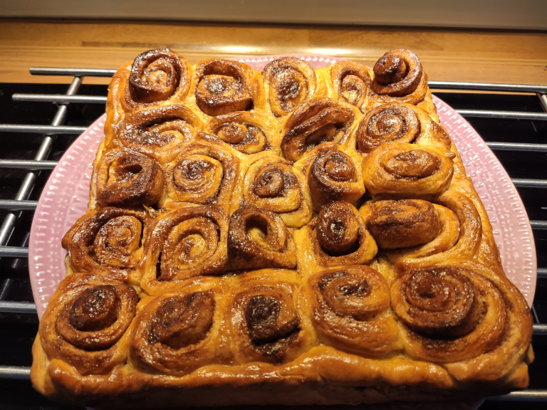 Efterhæver i ca. 20 min. Derefter pensles kagen med sammenpisket æg.
