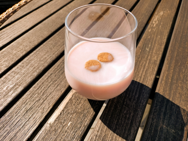 Æg, sukker, vanilje og juice piskes godt sammen, derefter piskes mælken i.