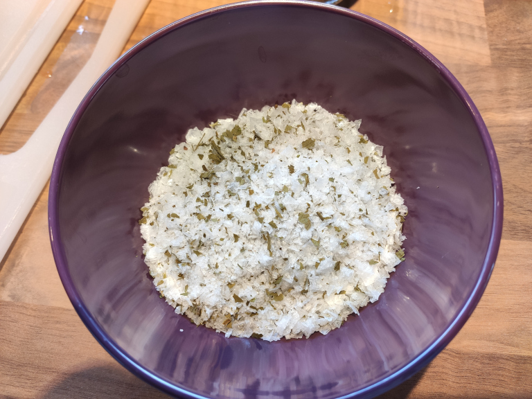 til 2½ dl kryddersalt - Jeg anvender flagesalt i denne opskrift, men brug den type salt du foretrækker - dog passer forholdene til groft salt og ikke fint salt.