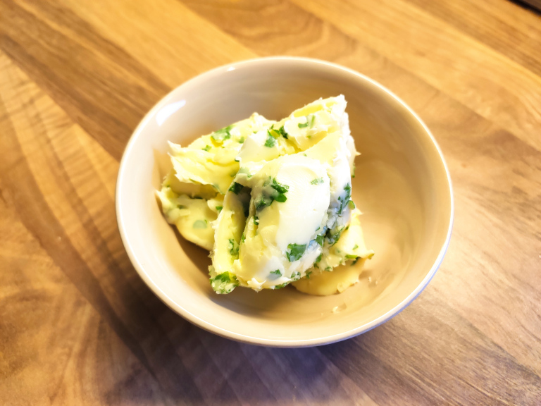 2 fed hvidløg, presset eller revet 125 g smør, blødt 1 spsk. hakket persille