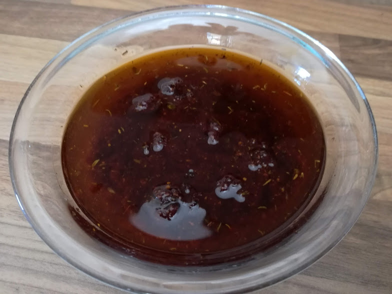 Alle ingredienserne blandes sammen, og kødet marineres heri i mindst 1 time evt. natten over i køleskabet.